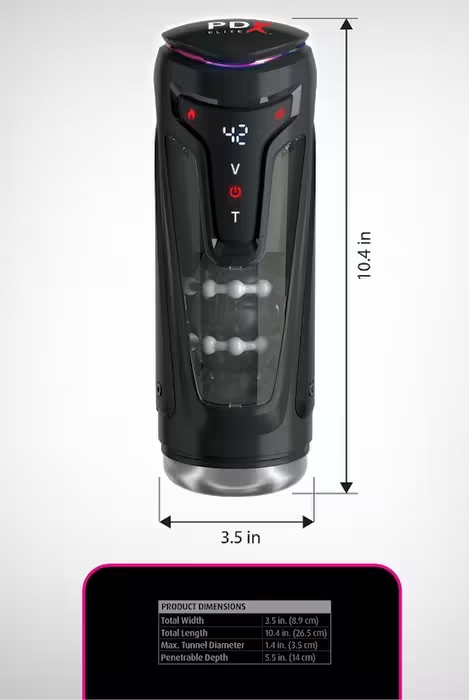 Masturbator Moto-Bator Pro von PDX Elite im handlichen diskreten Gehäuse. Mit kraftvoller Vibration und intensiver Stoßmassage von 3 Perlenkränzen, um rundherum den Penis verwöhnen. Dazu auf Knopfdruck die Wärmefunktion (2 Modi), um den Masturbator schnell auf die richtige Körper- und Betriebstemperatur zu bringen.